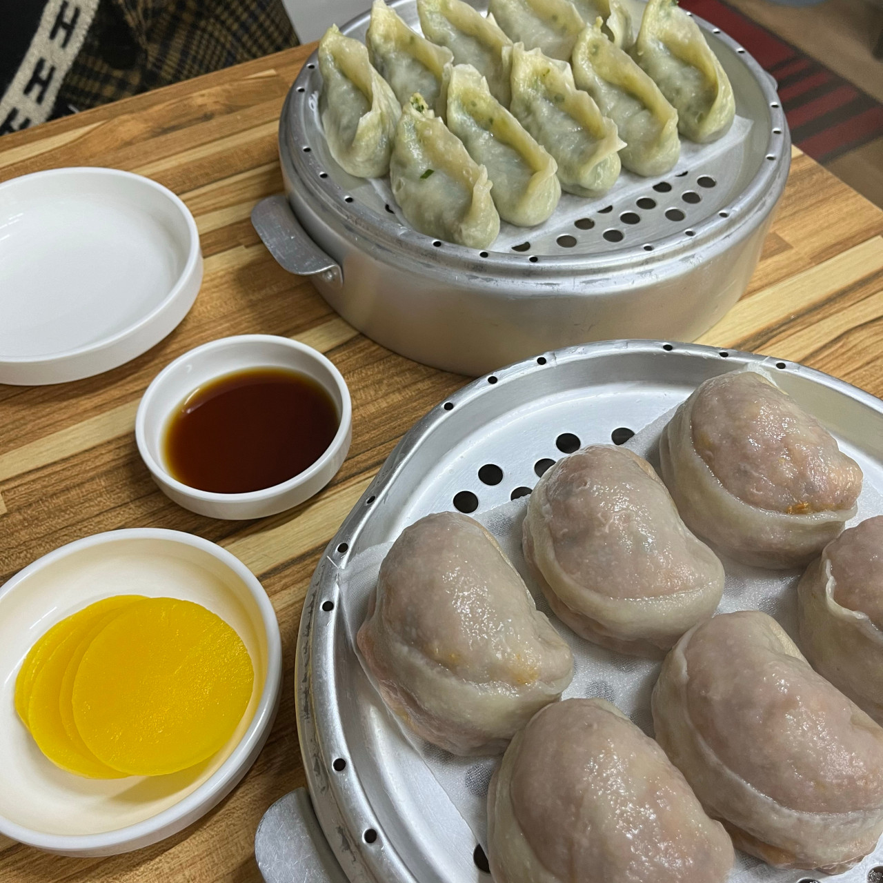 육즙 가득 고기만두와 매콤한 김치만두의 황금 조합