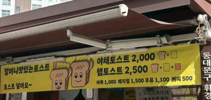 네, 맞습니다. 야채토스트는 2,000원, 햄토스트는 2,500원입니다. 한때 천원 토스트로 유명했지만 물가 상승으로 인해 가격이 조금 올랐습니다. 그럼에도 불구하고 여전히 서울에서 가장 저렴한 토스트 중 하나입니다.